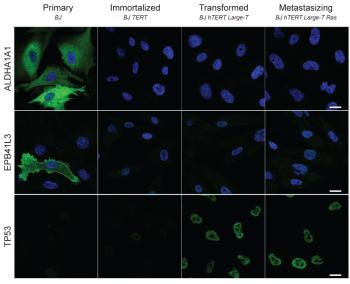 Majority of differentially expressed genes are down-regulated during malignant transformation in a four-stage modelFrom primary to malignant - what changes? Bridging transcriptomics and proteomics to reveal the molecular changes during malignant transformation in a four-step cancer cell line model In order to find out more about the changes that occur when a primary cell is transformed into an aggressive cancer cell, integration of biological information has proven to be successful. By bridging transcriptomics and antibody based proteomics data we showed how the major changes during malignant transformation could be scrutinized. The transformation of normal cells to malignant cancer cells is a complex process that requires a myriad of biological changes that give rise to new capabilities such as a higher rate of cell division, altered metabolism, and the ability of cells to invade into new areas. To get the picture of these changes on a molecular level we used four cell lines that all originate from the same primary fibroblast cell type and that each represent a different stage during malignant transformation, from the primary "slowly growing" cells to highly proliferative cells that are capable of metastasizing and form tumors even in distant organs. By sequencing the RNA of these cell lines, we observed that about 6% of all human protein coding genes are differentially expressed, and a majority of these are down regulated on the route to cancer. The up regulated genes are mainly involved in progression through the cell cycle and functions needed for the cells to divide at a higher rate. The downregulated genes are mainly encoding proteins that are expressed on the outside of the cells, indicating the ability of cancer cells to shut down many functions in order to fully focus on growth and division. The large repository of in-house generated antibodies in the Human Protein Atlas enabled us to pursue our investigations with protein analysis using both immunofluorescence and immunohistochemistry. Several interesting candidates with differential protein expression patterns between the different cell lines were found. A subset of these where analyzed in matched sets of cancer tissues with different degree of malignancy where the expression patterns seen in the tissue samples were highly correlated to our observations in the cell lines. This paper exemplifies well how an integrative approach can be used to profile the molecular changes underlying malignant transformation. The possibility to validate the results generated with RNA sequencing on protein level, both in the same cell lines as well as in matching real cancer tissues, also laid the ground for future studies of cancer related mechanisms using the same cell line model system. Read the full article about molecular changes in malignant transformation here. Also read our other blog posts related to cancer: