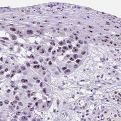 2017-05-24 Melanoma is a common form of cancer in the skin and among skin cancers it is the most deadly form. Melanoma originates from cells of melanocytic origin and most typically begins as a small intraepidermal tumor (melanoma in situ). As the tumor continues to grow and progress, tumor cells invade the epidermis and eventually spread to regional lymph nodes and subsequently via hematogenic spread to distant organs. Tumor thickness of the primary tumor is the most important determining prognostic factor and thus is early discovery of key importance for survival. The cancer image of the month shows skin with growth of a cutaneous melanoma. Melanoma cells are seen underneath epidermis in the left half of the image. Tumor cells have large nuclei with irregular and large nucleoli that clearly express the Nucleolar protein interacting with the FHA domain of MKI67 protein (NIFK). The melanoma cells represent a rapidly growing cell population with a high level of proliferation. The covering epidermis also shows keratinocytes with large nucleoli expressing NIFK, although these keratinocytes in the upper half of epidermis are undergoing terminal differentiation and have lost their proliferative capacity. NIFK interacts with the proliferation marker Ki-67 (MKI67), which is the most used immunohistochemical marker in clinical medicine. This marker is used to assess the level of proliferation in a wide range of different tumors, since the Ki-67 protein is expressed throughout the active cell cycle (G1-S-G2-M). Although the precise function is unknown, NIFK also binds to RNA and nucleotides. View normal tissue expressing NIFK and MKI67. For more information about the cancer proteome visit our portalCancer Proteome! Fredrik Pontén |