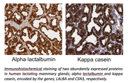 Myoepithelial cells are found in a discontinuous layer between the lobular epithelial cells and the basal lamina. They respond to oxytocin by contracting and stimulating secretion. During pregnancy, the mammary epithelial cells proliferate intensely due to the action of an array of several hormones. The number of mammary epithelial cells increase exponentially. This imposes the glands to undergo a drastic and remarkable morphological transformation in preparation for lactation. For this to happen, the key players; estrogen, progesterone, prolactin and placental lactogen carry out their specific function at distinct time-points in a beautifully orchestrated interplay. Progesterone and estrogen stimulate the proliferation of the mammary gland, but inhibit lactation before birth. Prolactin and human placental lactogen stimulate the terminal lobules to alveolar differentiation in late pregnancy. The alveolar cells produce a highly nutritious white fluid, rich in carbohydrates, proteins and lipids, we all know as milk. After giving birth, the progesterone and estrogen levels drop which results in copious production of milk. Also, the plasma cell population increase significantly in the surrounding connective tissue during the later stages of pregnancy. Plasma cells produce secretory immunoglobulins (IgA), which is transferred through the milk to provide some degree of passive immunity to the infant. At the end of breastfeeding, most alveoli and ducts that develop during pregnancy undergo degeneration in a process called involution. In the pictures above, two proteins expressed in the active stage of lactation in the mammary gland can be visualized. Alpha lactalbumin (LALBA) is a principal protein of milk required for the proper function of the enzyme Lactose synthase in the mammary gland. Lactose synthase produce lactose; the major carbohydrate in milk. The Kappa casein, encoded by the CSN3 gene, is an important protein for the structure and stability of the micelle, a component in milk that makes it possible to deliver high amounts of protein and insoluble molecules to the infant. Besides these two proteins, another eight proteins expressed in the lactating mammary gland have been analyzed. To learn more about proteins important for other female organs pay a visit to the endometrial, ovarian and placental-specific proteome landing pages.