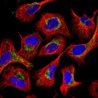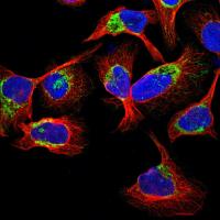 2017-11-24 Staining of NFIL3 (green) in nuclear bodies with DNA (blue) and microtubules (red) in A-431 cells. Many human genes follow a so called circadian clock and research has shown that some of those genes themselves follow the seasons (Dopico et al. 2015). When winter is coming, you sense it and your genes know it too. Expression of one of those genes, NFIL3, peaks during December until February and has its lowest expression during the summer months. NFIL3 is a transcriptional regulator involved in regulation of immune processes. Like many other transcription regulators it localizes to nuclear bodies as seen on the Cell Atlas images and binds to specific DNA motifs...Read more TPX2 is a key component in the formation of the mitotic spindle