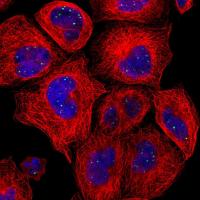 2017-11-24 Staining of NFIL3 (green) in nuclear bodies with DNA (blue) and microtubules (red) in A-431 cells. Many human genes follow a so called circadian clock and research has shown that some of those genes themselves follow the seasons (Dopico et al. 2015). When winter is coming, you sense it and your genes know it too. Expression of one of those genes, NFIL3, peaks during December until February and has its lowest expression during the summer months. NFIL3 is a transcriptional regulator involved in regulation of immune processes. Like many other transcription regulators it localizes to nuclear bodies as seen on the Cell Atlas images and binds to specific DNA motifs...Read more The HPA at the Image-based Cell Atlas Meeting